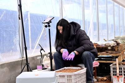 2026年3月18日在湖北省十堰市郧阳区谭家湾镇黄畈村郧阳筐栽天麻种植示范基地大棚里,基地主播正在线上直播销售筐栽天麻。