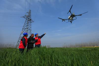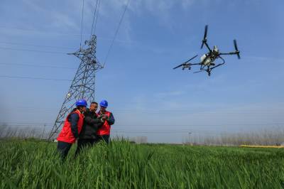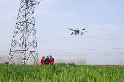 2026年3月20日,在湖北省襄阳市枣阳市熊集镇熊集村的麦田里,国网枣阳市供电公司工作人员正在向植保无人机飞手发放农村防外破宣传手册,并向其宣传电力设施保护知识,防范植保无人机不规范作业引发的电力设施外破风险,确保农业生产与电网运行双安全。