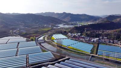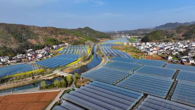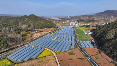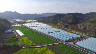 2026年3月20日,无人机拍摄的十堰市房县化龙堰镇上湾村智能滴灌蔬菜基地、智慧循环水高密度养鱼产业园。