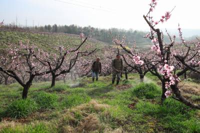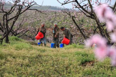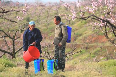 2026年3月21日,枣阳市吴店镇田台村桃农正在盛开的桃园里植保护树,维护桃树树体健康,提升坐果品质。春季桃树萌芽、展叶、开花、坐果,需要消耗大量养分,若病虫害侵扰,会消耗树体养分,导致萌芽不齐、叶片发黄、花朵易脱落,直接影响后期果实产量和品质。春季防治能保障树体健康生长,为优质高产打下基础。