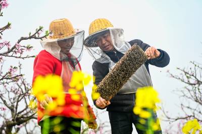 2026年3月24日,湖北省黄冈市浠水县竹瓦镇长中村,蜂农正仔细查看蜂箱巢脾上的蜜蜂。作为当地知名的桃子种植专业村,长中村立足特色产业,探索 “桃林 + 养蜂” 的生态农业模式,通过科学配套养殖蜜蜂,既为桃树授粉提质、助力桃子增产增收,又产出优质蜂蜜,实现了 “一田双收” 的生态效益与经济效益,走出了一条绿色高效的乡村产业振兴之路。