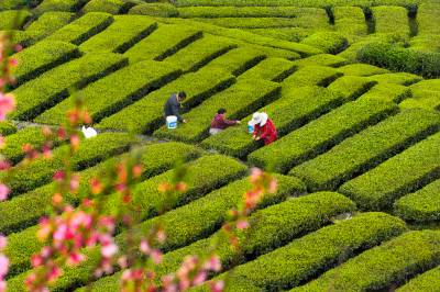 2026年3月25日,三峡库区湖北省宜昌市秭归县茅坪镇中坝子村一茶园,村民正在采摘春茶。近年来,地处三峡库区的湖北省宜昌市秭归县,凭借优良的生态环境和独特的峡江气候,建成优质茶园12万亩,其中3万亩春季早茶提前20天上市,而夏秋茶的利用率也从30%提升至65%,形成“春茶赶早、夏秋提效”的产业格局,促进农民增收致富,助力乡村全面振兴。
