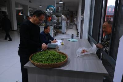 现代化的茶叶加工厂内,技术人员正在收购茶农刚采摘的鲜叶,准备晚上加班加点加紧制作,供应市场。
