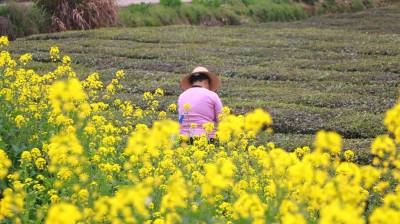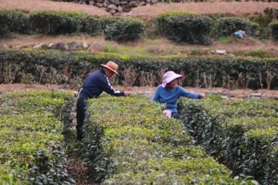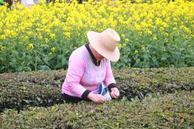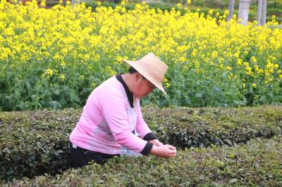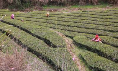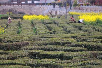 1000多亩连片的绿色茶园,田垄状的茶畦顺着山势层层铺展开来,村民背着茶篓,指头在枝叶间舞动,一叶叶细芽飞入篓中,整个茶园茶香四溢,一派生机勃勃的丰收景象。润绿醉人的茶香,也吸引不少市民前来踏青赏景,体验采茶的乐趣,感受春茶的芬芳。
