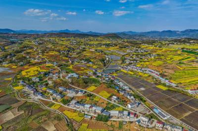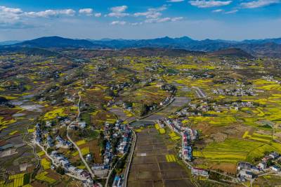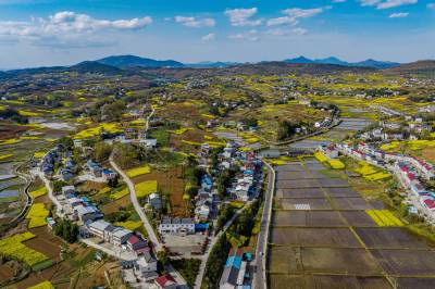 3月28日,竹山县宝丰镇深沟村,油菜花海与村落、公路、水田、青山相互映衬,构成一幅和美乡村画卷。
