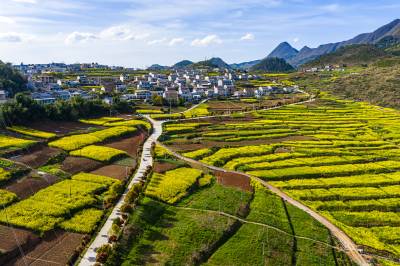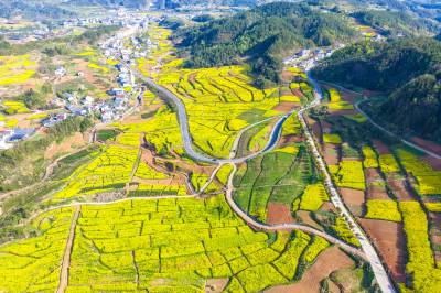 4 月 1 日,竹山县秦古镇大堰村千亩油菜花竞相绽放,金黄花海连绵起伏,与蜿蜒公路、特色民居、清澈河道相映成趣,构成一幅秀美的春日画卷,吸引不少游客前来踏青赏花、拍照打卡,尽享田园风光。