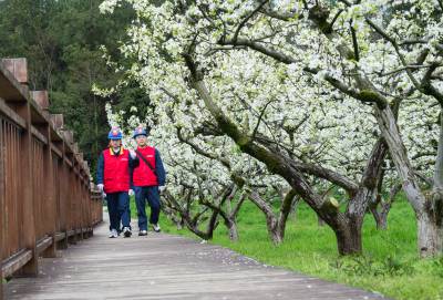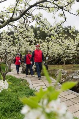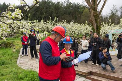 3月31日,电力工人在椒园镇黄坪村连片成块的黄金梨园巡视检查电力设施,开展安全用电宣传,为果农生产提供安全、优质电力。 宣恩县椒园镇黄坪村是全国文明村和黄金梨之乡,黄金梨从开花到果实成熟,引来大量游人前往观花和采摘体验。国网宣恩县供电公司针对果农用电需求,组织“楚天星火”共产党员服务队,按照黄金梨生长、成熟、采摘和储藏等环节制定季节性保电方案,确保果农生产用电无忧,助力乡村振兴。