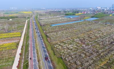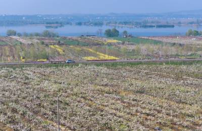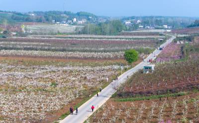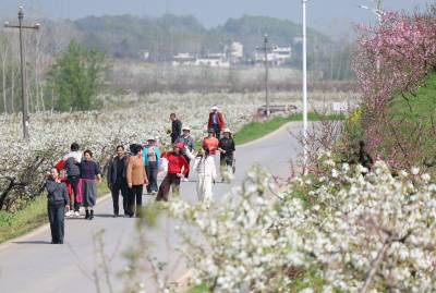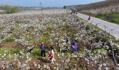 4月1日,游客在襄阳市老河口环梨花湖生态旅游公路沿线的梨园赏花游玩。 据介绍,襄阳市老河口环梨花湖生态旅游公路按照生态、环保、旅游公路标准建设,打通老河口市至丹江口市旅游交通环线,将当地梨花湖景区、洪山嘴万亩梨桃基地、桃花浔景区等景区一线串联,沿途可一览万亩梨花、民俗风情、美丽乡村与自然风光,吸引众多游客驾车观光。