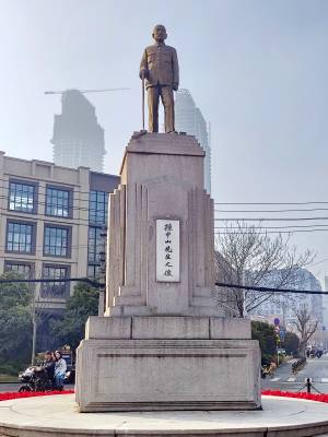 孙中山铜像位于武汉市江汉区汉口六渡桥闹市区,三民路、民族路、民权路、长堤街交汇处广场中央。由宋庆龄、何香凝、毛泽东、董必武、吴玉章等在1927年3月在汉口参加国民党二届三中全会时提议。汉口特别市政府于1929年开始筹建。1933年6月1日落成、江小鹣设计。像高2.15米,背南面北,免冠着中山装,右手执杖,左手微垂,右腿直立,左脚向前,双目远眺。像座为石砌,高4米,呈方台形。正面镌"孙中山先生之像"七字,两侧及背面原刻像赞,铜像四围环以花坛与护栏。孙中山铜像己是湖北省武汉市文物保护单位。孙中山先生铜像历经了北伐战争、抗日战争、解放战争等多次战火,曾多次遇险,但最终都转危为安。孙中山先生铜像历经风雨93年来,受到了一代又一代人的瞻仰,得到了市区文旅文物住更局等单位的格外重视保护。