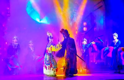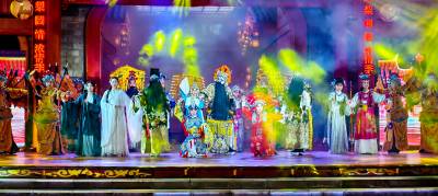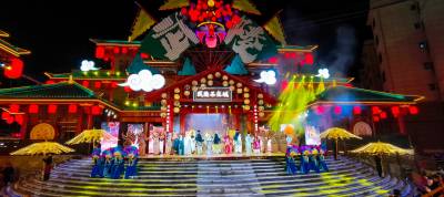 竹溪县的戏曲演出主要浓缩在武陵不夜城,吃过晚饭来到大门口,两旁高大的巨幅山二黄的人物剧照竖立在两旁,由雕像告诉你,你己经来到了非物质文化戏曲演出一条街。大门口台阶上为第一个舞台,开场演出山二黄剧团几乎全员出动,阵容庞大,锣鼓喧天,唱腔飞扬,加上变幻的灯光秀,让山二黄的舞台演出魅丽四溢,具有极高的视觉冲击力。