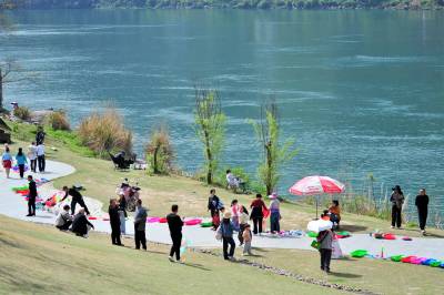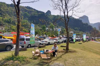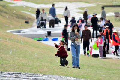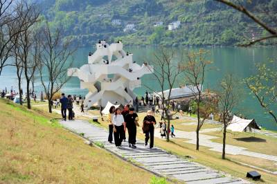 2026年4月4日,在长江西陵峡岸边的宜昌市夷陵区乐天溪镇莲沱畔公园里,“春洄”城市周末聚会的游客在探索风车观景区游览春日峡江风景。当日是周末、清明假期第一天,宜昌“春洄”城市周末聚会活动在长江西陵峡岸边的宜昌市夷陵区乐天溪镇莲沱畔公园里启动,各地游客纷纷自驾来此“休息”,在江畔“过一种不同的生活”,把周末过成春天的样子。