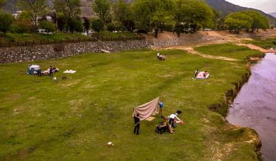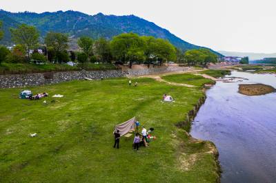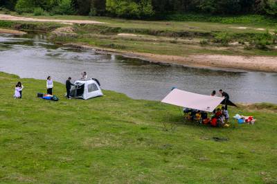 2026年4月6日,清明节假期最后一天,天气晴好,春光明媚,大批市民来到湖北省英山县孔家坊乡新铺村“西河十八弯·乐乡湾”河滩快乐度假、露营。游客搭起帐篷,边晒太阳边欣赏西河生态美景,其乐融融,惬意无比。