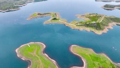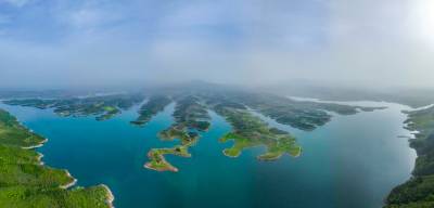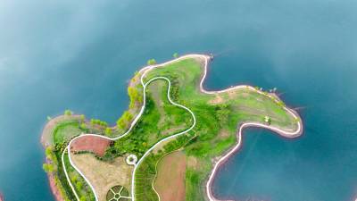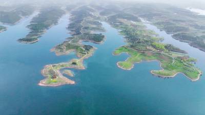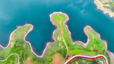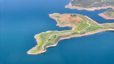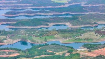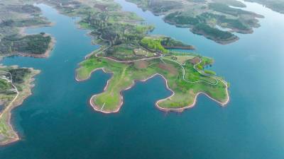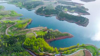 2026年4月4日,湖北省郧阳区汉江北岸10000多亩地的安阳镇汉江绿谷绿地泛青,树枝吐绿,江面千岛湖画屏景观吸引着众多游客和摄影爱好者前来打卡拍照。