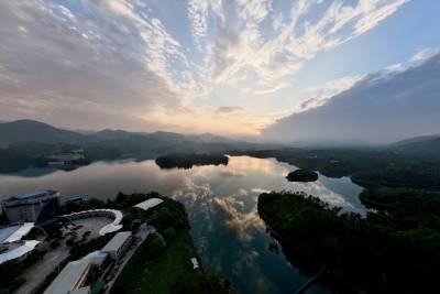 2026年4月15日,当夕阳西下的时刻,晚霞透过云层倒映湖北省襄阳市南漳县水镜湖面上格外美丽。