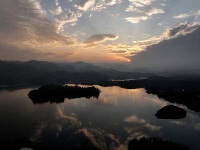 这一刻,时间仿佛慢了下来。水镜湖像一位沉思的诗人,把天空的壮丽收敛在心底,只露出浅浅的笑意。山影渐渐模糊,湖水的颜色也由橙红转为黛青,像一幅正在收卷的水墨画。