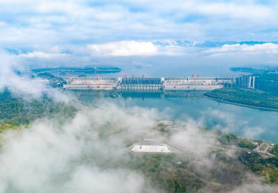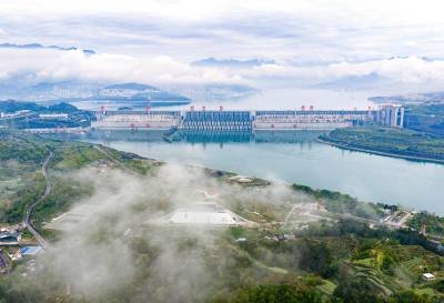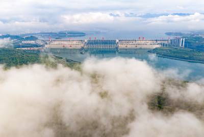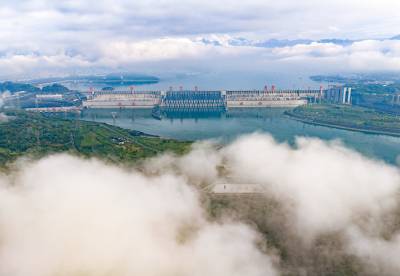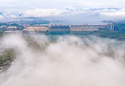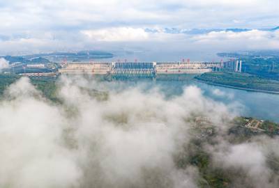 2026年4月12日,湖北省宜昌市三峡坝区雨过天晴,云雾缭绕,与雄伟的三峡大坝交相辉映,美景如画。