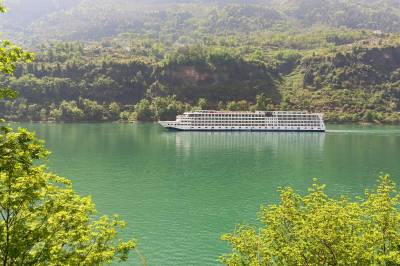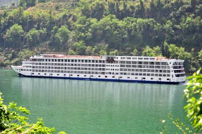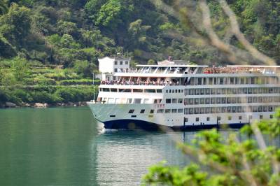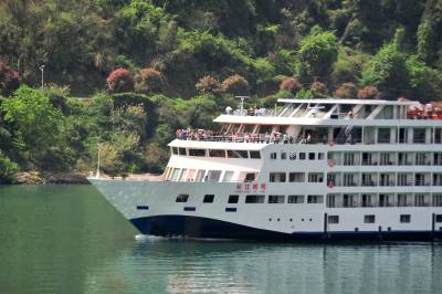 近日,“长江贰号”游轮载满游客畅行在宜昌市夷陵区乐天溪镇境内的长江西陵峡水域。春日,西陵峡秀美春景吸引各地游客乘坐游轮“舟”游峡江山水风光,在青山绿水中欢度假期。