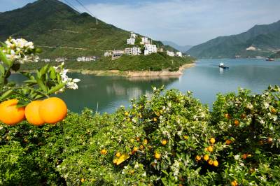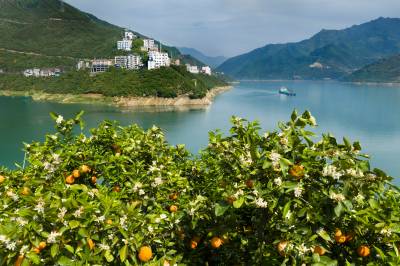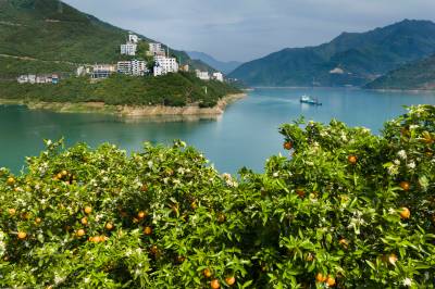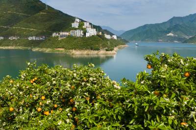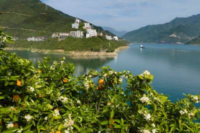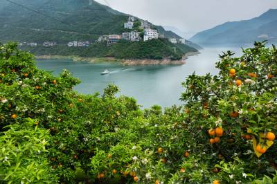 2026年4月17日,三峡库区湖北省宜昌市秭归县泄滩乡陈家湾村,漫山遍野的夏橙园里呈现花果同枝的靓丽景观,去年的橙子还没采摘,今年的橙花又开了。长江边的泄滩山高坡陡,泄滩人民凭着顽强不屈的精神在陡峭的山坡上开辟出一亩亩橙园,并利用得天独厚的峡江小气候培育出独树一帜的夏橙品牌,错季销售的夏橙商品价值较高,让泄滩人民增收致富,也让泄滩乡的陈家湾村、棋盘岭村成为“夏橙亿元村”。