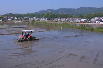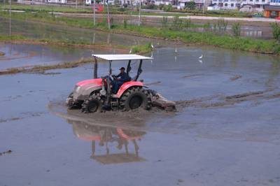 2026年4月19日,春耕时节,在湖北省英山县南河镇灵芝村高标准农田,农机手驾驶拖拉机忙碌地耕作,吸引一群白鹭在一旁伴飞觅食。 只见拖拉机来往穿梭,正在紧张翻耕水田。伴随着隆隆的农机声,大批白鹭陆续飞来,它们或在翻耕后的田地里嬉戏打闹,或在田野上空低空飞舞,灵动的身影点缀在沃野之上,构成一幅诗意盎然的生态美景。种粮大户介绍说,由于发展生态农业,他们减少了农药、化肥的使用,田里虫子、泥鳅、小虾也丰富起来。每到翻耕时节,就会吸引许多白鹭前来觅食。