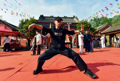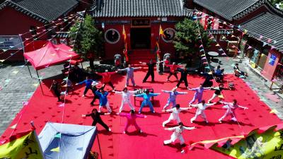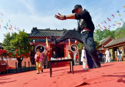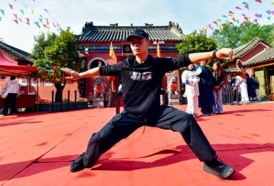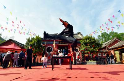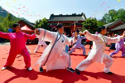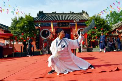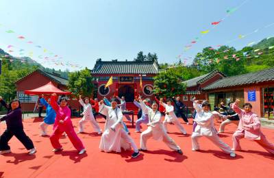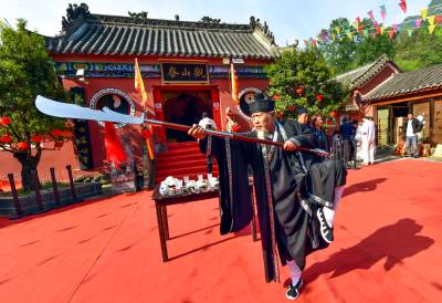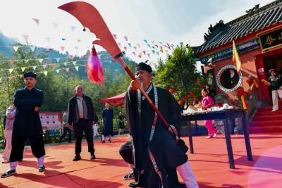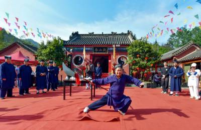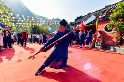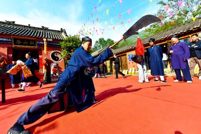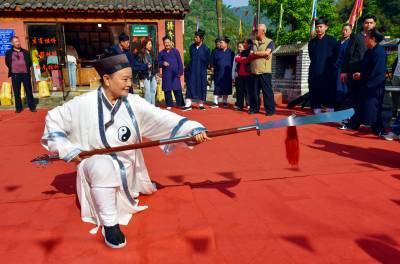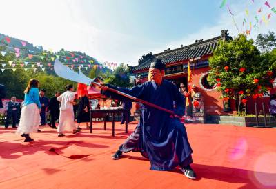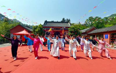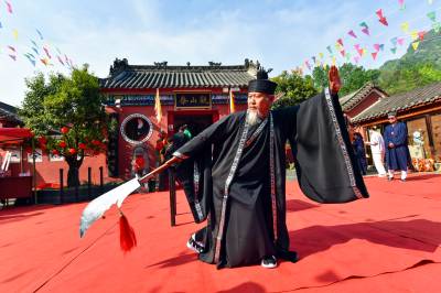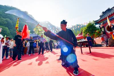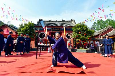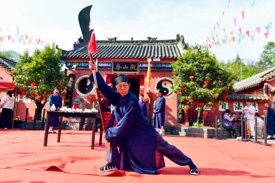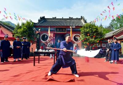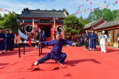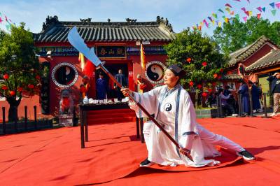 2026年4月19日,十堰市武当山下的茅箭区赛武当景区内泰山观举办农历三月三庙会,道长、道士、道姑、武当武术传承人,以及来自市区奥体中心的真元太极队学员纷纷登场表演展示刀术和太极拳功夫,引来游客围观拍照。天下太极出武当,太极拳,是一种吸取了古代哲学、医学、兵法学、道家思想、儒家思想等学科理论的拳术运动,是中华武术之瑰宝,展现了中国传统文化的精髓,促进了社会和谐,是增进人类友谊的桥梁和纽带。如今,太极拳已经上升为全民健康的需要,成为推进健康中国建设、提高人民健康水平的传统文化代表。目前,十堰市各县市区组队练习太极拳的人数达5万多人。