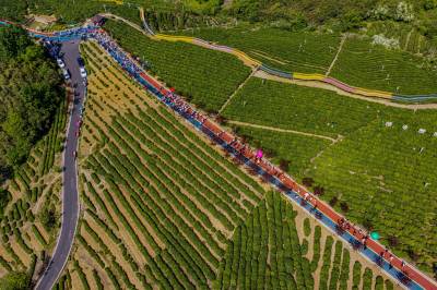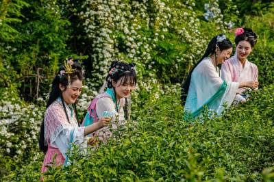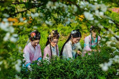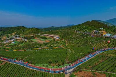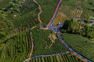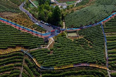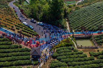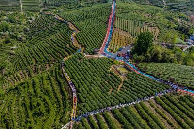 4月19日,竹山县第四届茶旅文化月暨宝丰镇“双龙汇聚·共富茶香”有奖巡游活动在龙井村智慧茶山举行。活动现场,竹山龙井与西湖龙井代表互赠茶种,寓意两地携手共富。文艺展演环节,绍剧、宋韵汉服秀、太极、茶艺等节目轮番登台,赢得阵阵掌声。游客身着汉服、村民穿着传统服饰,在绿意盎然的茶园中沉浸式感受春日茶香。随后,群众代表沿智慧茶山步道游览,尽览生态茶园风貌。数十家本地茶企及农特产品经营户现场展销,吸引众多游客品尝选购。本次活动以茶为媒、以文会友,旨在提升“武当山茶·竹山硒茶”品牌影响力,推动茶旅深度融合,助力乡村振兴。(视界网 章磊 摄)