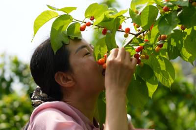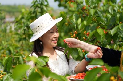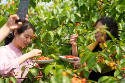4月19日,十堰市郧阳区安阳镇安阳口村安阳湖农科园内,一颗颗晶莹剔透、色泽鲜红的樱桃挂满枝头,十分诱人,吸引众多游客前来采摘、品尝。