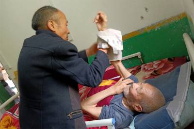 老人出院后只能卧床休息,童德生把老人安顿在身边,并在网上专门为老人买了呼叫机,三个按键都是存的他的电话。喂饭、翻身擦洗、换纸尿裤、按摩双腿……这些琐事对常人来说都不易,对身患残疾的童德生而言更是艰难。每一次搀扶、每一次起身,他都要付出数倍于常人的力气,可他从不抱怨。