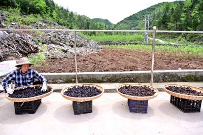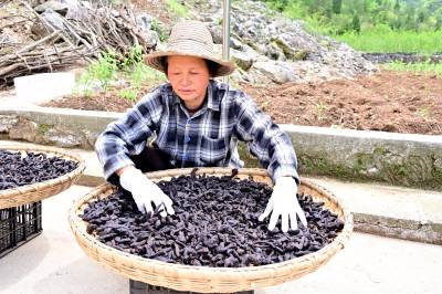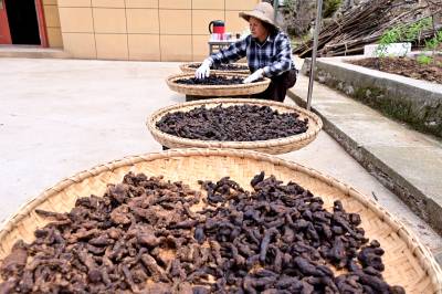 4月22日,十堰市郧阳区大柳乡黄龙庙村村民在家门口晾晒经过“九蒸九晒”传统方法制作的黄精。 近年来,郧阳区大柳乡利用自身气候资源禀赋发展黄精林下种植,并采用“九蒸九晒”传统方法制作黄精,成为当地农民的增收渠道之一。视界网王涛摄