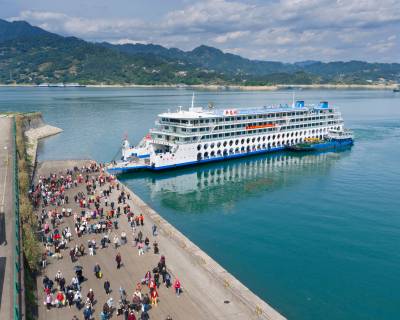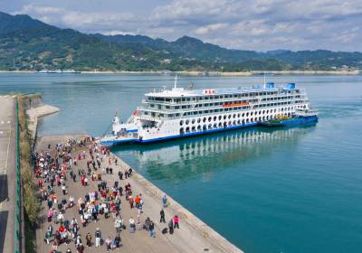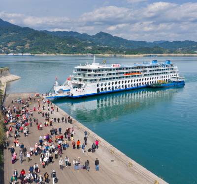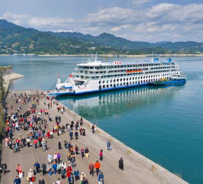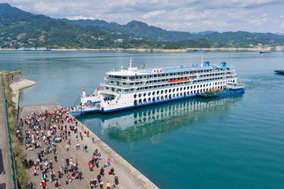 2026年4月23日,滚装客船“新高湖”驶向三峡库区湖北省宜昌市秭归港银杏沱滚装码头,靠泊后众多游客下船上岸。滚装客船“新高湖”是三峡库区唯一“人车同游”的客车滚装运输船舶,于4月初完成新能源汽车运输安全的改造升级,筑牢新能源汽车水上运输安全屏障,为自驾新能源汽车出游的旅客打造更安全、更安心的水上出行体验。