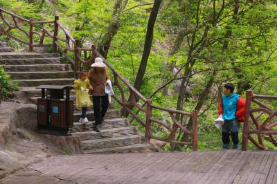 2026年4月25日,游客在位于湖北省英山县的大别山主峰风景区观赏挂天瀑景点,挂天瀑是大别山主峰周缘海拔最高、落差最大的瀑布。 只见花岗岩质断壁,倾角近直立,高约80多米。山泉飞泻而下,仰面迎上,虹光万道,水天一色,宛若天空悬挂的一条白练,蔚为壮观。
