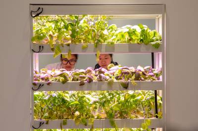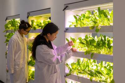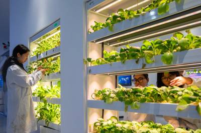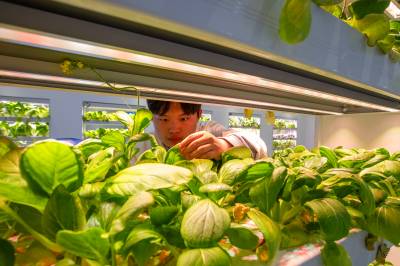 2026年4月27日,湖北襄阳,襄阳职业技术大学农学院智慧农业产教融合实训中心,学生正在观察智能种植柜中水培蔬菜的生长情况。该中心集成无土水培、物联网管控、智能温室、虚拟仿真等技术,打造“赛博农田”教学场景,推动产教深度融合,助力培育懂技术、会操作的乡村振兴新型人才。