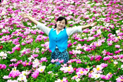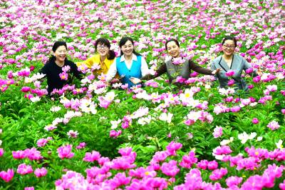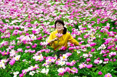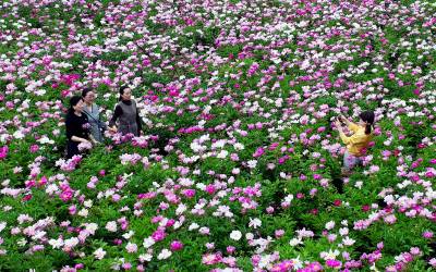 2026年4月27日,游客们醉在湖北省襄阳市南漳县九集镇古林坪村的芍药花海中。