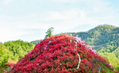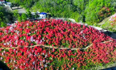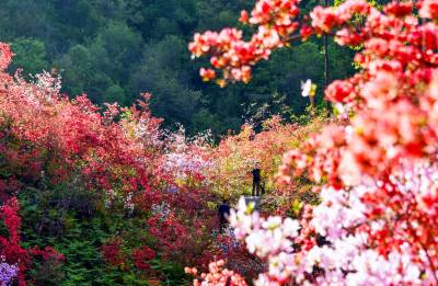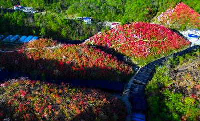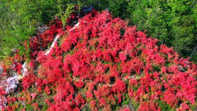 2026年4月26日,房县野人谷镇千家坪村野生杜娟花开吸引着许多游客前来打卡拍照。千家坪村座落在海拔1200米,植被丰富,绿水青山,红色和粉色杜娟花在山梁之间星星点点,好似万山绿中一点红。而最为集中的地方拥有4个山梁,几百亩野生杜娟竞相开放红似火,为“五一”国际劳动节高山旅游观花提供了好去处。