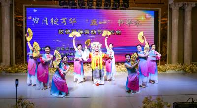 男声独唱《画你》深情嘹亮,朗诵节目《岁月绽芳华 五一书华章-致五一女神》以铿锵有力的语言,致敬平凡岗位上的劳动者;京剧彩唱《梨花颂》婉转悠扬,非洲鼓表演《聚会歌》节奏明快,戏曲联唱韵味十足,书画爱好者现场挥毫泼墨,情景表演《锅碗瓢盆交响曲·夫妻和睦盼兴旺》则以诙谐生动的形式,展现了家庭和睦、邻里相亲的美好生活图景。整场演出形式多样、亮点纷呈,涵盖舞蹈、京剧、朗诵、独唱、情景表演等多种艺术形式,既有对劳动精神的礼赞,也有对传统文化的传承,更有对美好生活的向往。