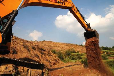 18日,黄石湖北华鸿农贸有限责任公司两台挖掘机正在大冶还地桥镇一个荒山坡地平整土地。