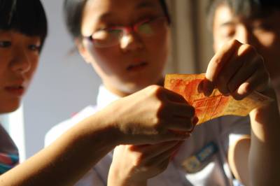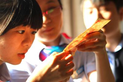 19日,几名收费员正在对着光线仔细观察一张假币的特征。一直以来,高速公路都是假币的重灾区,每年都因假币给从事收费工作的员工带来数百元的损失。近期,假币警情不断,湖北京珠鄂南收费站加大对新进员工的培训力度,以提高他们识别假币的能力。(祝巍)