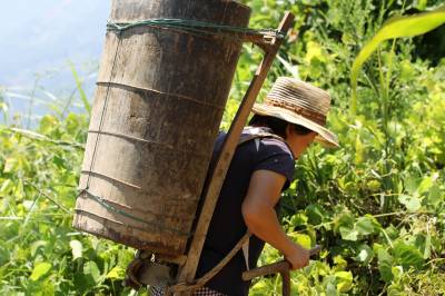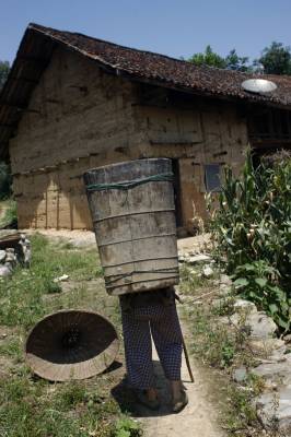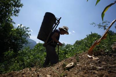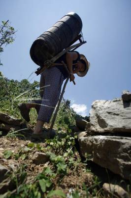 2011年8月17日,家住湖北省五峰土家族自治县五峰镇怀抱窝村一组农民肖长玉,从山沟背回一桶水,艰难的行走在火山坡上。近一个时期持续高温,导致山泉干枯,供水不足。本来从2002年以来已经用上了自来水,背水吃的情景再现眼前。