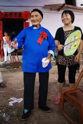 今天,是三峡库区湖北省秭归县的沙镇溪镇乐丰村张登科老太太百岁生日,张老太太近百名子孙从四面八方来到张家,喜庆老人百岁华诞。秭归县委和当地镇村领导为老人颁发了长寿之星的匾牌。张老太太1911年8月20日出生在乐丰村一个贫困农民家庭,80年前和本村王昌太结婚,1988年7月丈夫去世,享年78岁。生育了8胎,存3子3女,大儿子今年2月去世,也是78岁,最小的儿子王祖生今年54岁。目前老人和3个儿子生活,五代同堂,已有玄孙3个。老人几十年都生活在山里,勤劳为本,生活简朴,睦邻友好,性格开朗,乐于助人,有祖传小儿科医术,经常为当地小孩推拿诊疗疾病。据秭归人口普查资料表明,当地100岁老人已达6名,80岁以上老人已达1.5万人。