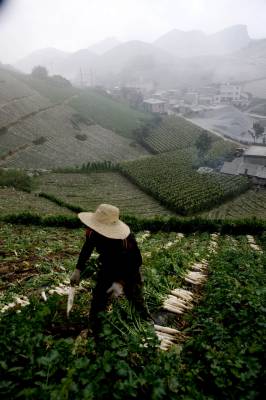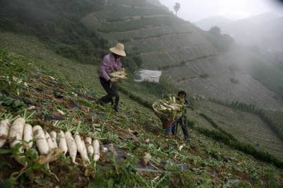 长阳无公害蔬菜 已成为农民“聚宝盆” 2011年8月20日,菜农在田间收获白萝卜。湖北省长阳土家族自治县利用得天独厚的高山地貌和远离无工业污染区位优势,大力发展无公害蔬菜产业,蔬菜已成为高山农民的“聚宝盆”。目前,全县高山蔬菜面积达到50万亩,现金收入可突破20亿元。基本形成了规模化种植、标准化生产、商品化经营的格局。该县“火烧坪”乡高山蔬菜畅销国内30多个大中城市和日本、新加坡、泰国、港、台等国家和地区。文振效