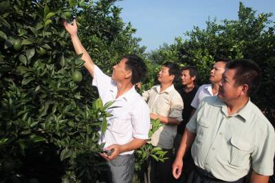 合作彰显合力 8月19日,枝江市裴华圣柑橘专业合作社理事长侯克华(左一)正在指导社员管理脐橙。该合作社以实际行动贯彻落实科学发展观,因地制宜,大力推广脐橙种植技术,助农增产增收,去年脐橙收入达到10万元的有19户,在5万元以上的达到35户。本报视界网刘卫东摄