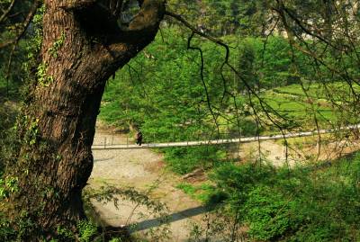 从咸丰县城出发,沿西北方向驱车60公里,即可到达小村。盘山公路沿着蓝河逆行而上,向左远望,碧绿的森林、原生态的茶园,还有一座座颤悠悠的甩甩桥跨越蓝河,与河对岸的山里人家相连,车在景中行、人在画中游,一幅“小桥流水人家”的曼妙画面映入眼帘……