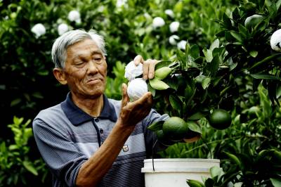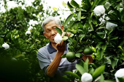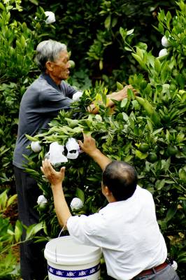 8月21日, 宜昌市夷陵区鸦鹊岭镇梅店村一组70岁的村民刘传寿正在给柑橘带“太阳帽”。 入秋以来,“秋老虎”发威,闷热的天气,火辣辣的太阳,致使部分柑橘果子发生日灼病,出现“太阳疤”,这样不仅影响柑橘的品质,而且很难成为商品,直接影响到柑农的收入。针对此情况,该区农业部门派出专业技术人员,带着防治日灼病的资料,分赴到各村桔园里进行技术指导,并利用卫生纸、白纸袋和专业防护纸,对柑桔果进行贴纸、套袋等防护工作。 本报视界网 周建平 易正权 摄
