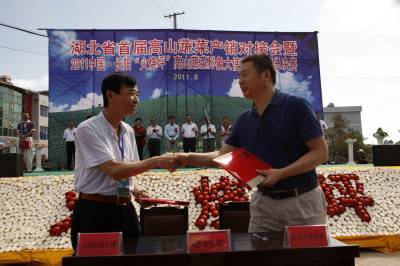 2011年8月21日,客商在湖北首届高山蔬菜产销对接会上签订高山蔬菜销售协议。当天,由湖北省蔬菜办、蔬菜协会主办湖北省首届高山蔬菜产销对接会在长阳土家族自治县火烧坪乡举行。会上来自上海、深圳、武汉等地蔬菜经销商与长阳县、恩施州利川市签订8亿元的高山蔬菜采购合同。同时,长阳“火烧坪” 高山蔬菜形象大使网络选拔赛进行寇亚军决赛。
