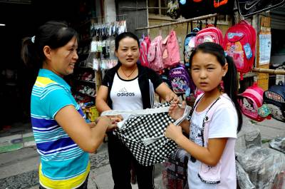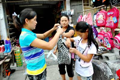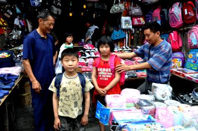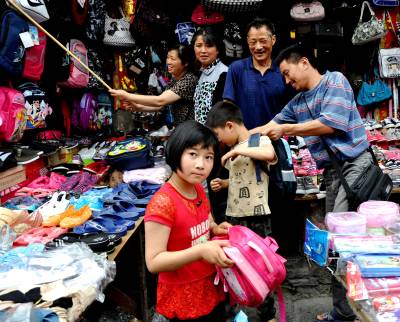 8月22日,恩施市红土乡已有很多家长带着心急的孩子前来购买书包。他们正争先挑选心仪的新书包,使书包摊成为市场的一大亮点。 随着中小学生开学的日子越来越近了,学习用具超市、书店、集贸市场都在这个期间迫不及待地加入开学消费大战,降价、打折,学生消费势头也持续上涨。米奇、维尼熊、加菲猫等印有各种卡通的学生书包深受小学生的欢迎。(本报视界网彭绍峰摄)