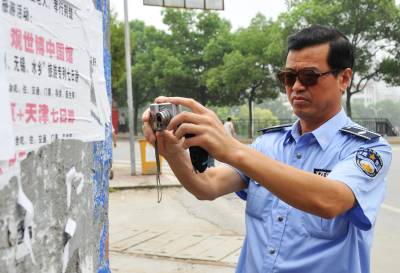 8月22日,郧县综合执法局执法人员张家生正在解放南路利用照相机拍照在广告张贴栏以外墙体上张贴的野广告,并将野广告取证相片和联系电话登记造册并输入电脑寻呼,直至当事人前来接受处罚。2010年度共处罚乱贴野广吿业主13000多个,今年元至7月共处罚乱贴野广告业主600多个,使乱贴野广告行为大幅度下降,市容环境大为改观。 图为执法人员张家生正在解放南路利用照相机拍照取证野广告相片时的情景。 周家山摄 郧县城管大队 电话13872840078 邮编442500