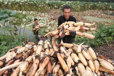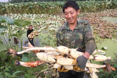 莲藕丰收 8月20日,专业挖藕人王春友帮曾都区南郊办事处柳树淌村种植专业户谢万云收获鲜藕,据谢万云介绍他今年种植的40亩莲藕喜获丰收 (本报视界网杨文明摄)