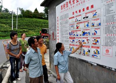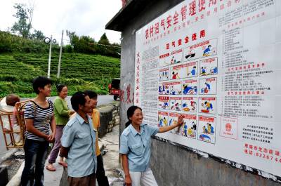 8月23日,在恩施市红土乡乌鸦坝村茅坝淌组,几位村民正在《沼气池安全使用》宣传栏前学习相关知识。 近几年来,该乡把农村沼气建设列为为农民办实事、办好事的民生工程和重点工程,加大投资力度,村村设有便民服务室。截至目前,全乡累计建成户用沼气池7000多户,每个补贴1000多元鼓励农民实现“一池三改”,不仅促进了农民增收和农村经济发展,还取得了明显的经济、社会、生态和能源效益。让农民过上了清洁、节能、低碳新生活,沼气建设惠民工程受到农民的青睐。(本报视界网彭绍峰摄)