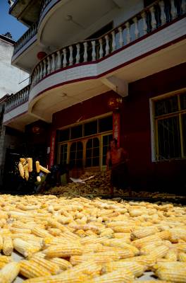 8月24日,宣恩县珠山镇卸甲坝二组村民肖永柏及其家人正高兴的翻晒丰收的苞谷。每年这个季节都将丰收1200公斤左右的包谷,主要用于喂养牲畜、市场散售以及苞谷粉深加工。
