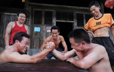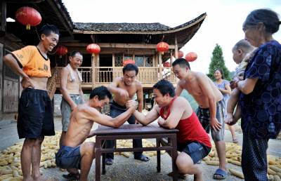 这不,在收获季节,在舍米糊村晒满了包谷、黄豆的石院坝里,汉子们又“较上了劲”。
