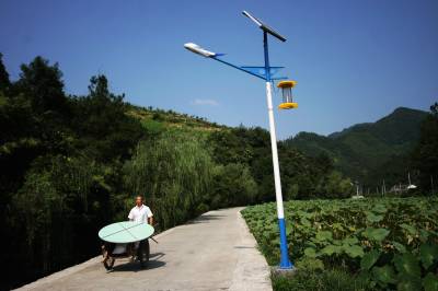为节约能源,打造低碳环保经济,竹山县观音沟村筹资45万元,对3.7公里长的通村路安装了65盏集照明杀虫于一体的太阳能环保路灯。该路灯不仅方便村民夜晚出行,还可为沿线1500多亩无公害蔬菜杀虫。(本报视界网 章磊摄)